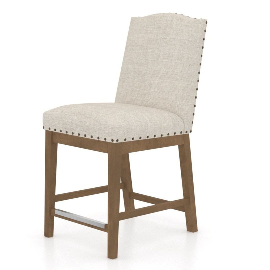 Canadel stools are 100% North American made in Canada out of Birch wood. Ā ThisĀ is a stationaryĀ stool available only at counter height. Ā It comes in over 40Ā different wood stains and 300 different fabrics. Can be done with or without nail heads.