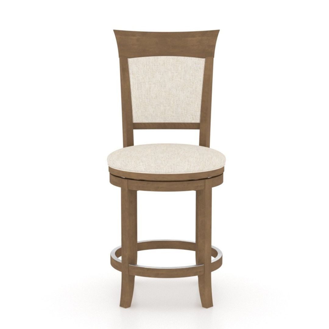 Canadel stools are 100% North American made in Canada out of Birch wood. Ā ThisĀ is a stationaryĀ stool available at counter height only. Ā It comes in over 40Ā different wood stains and 300 different fabrics.