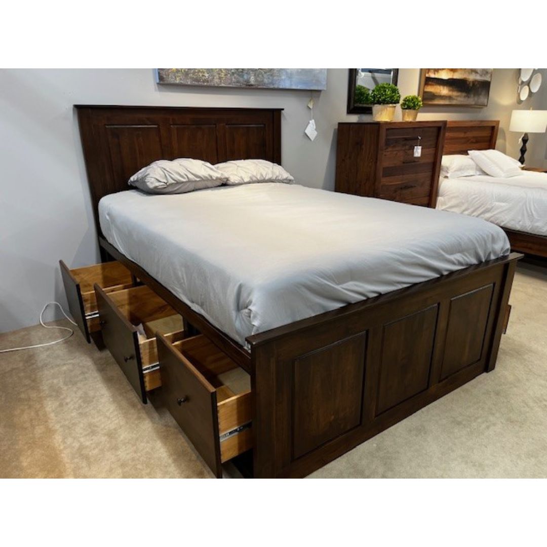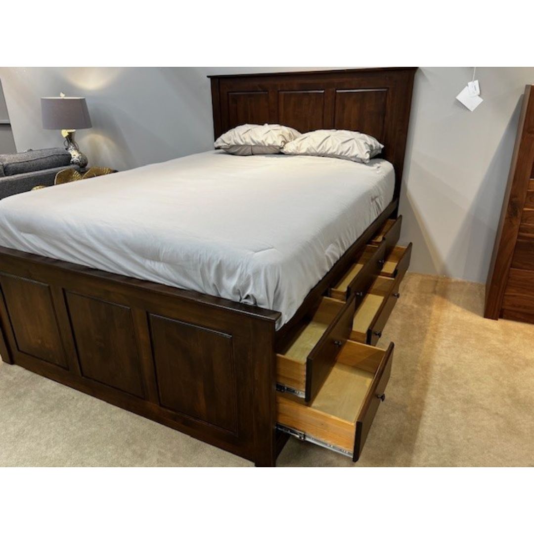 This Queen Storage bed by Archbold is made in OH of solid Alder wood.Ā It has 6 regular sized drawers on one side and 3 deep drawers on the other.Ā The configuration is reversible if you prefer the drawers on one side or the other.Ā Done in a dark brown finish.Ā Regularly it is $2599 but on clearance for $1999.Ā On display at our Whitehall showroom.