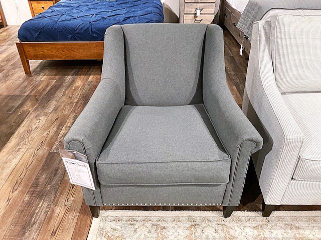 The Rowe Studio chair is 35 x 35 x 34H and comes with a rolled arm and tight back. It is done in a gray fabric. It is made in VA and backed by a manufacturers lifetime warranty on the springs and frames. Regularly $1339 but on clearance for $599, 1 available. Floor model only. On display at our Wexford location. MAKE AN OFFER!