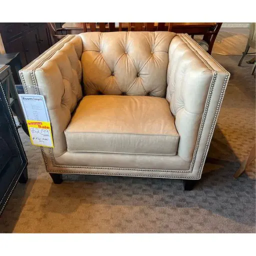 The 243 Chair by Smith Brothers is American made in Berne IN and comes with the manufacturers lifetime warranty on the springs, frame and seat cushion. The chair is done in a putty leather and is 39 x 38 x 33H. It is regularly $2629 but on clearance for $2199. Floor model only. Available for immediate pick up or delivery.