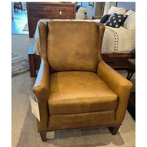 The 270 Chair by Smith Brothers is American made in Berne IN and comes with the manufacturers lifetime warranty on the springs, frame and seat cushion. The chair is done in a camel color leather and is 32 x 41 x 40H. It is regularly $1999 but on clearance for $1699. Floor model only. Available for immediate pick up or delivery.