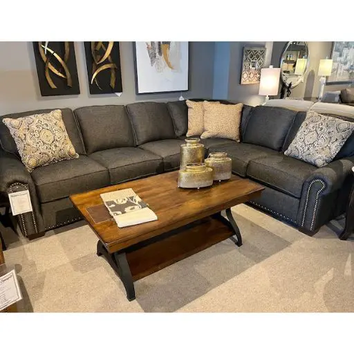 The 8000 sectional by Smith Brothers is American made in Berne IN and comes with the manufacturers lifetime warranty on the springs, frame and seat cushion. The sofa is done in a charcoal type fabric and is 120 x 96 x 39 x 37H. It is regularly $5489 but on clearance for $4499. Floor model only. Available for immediate pick up or delivery.