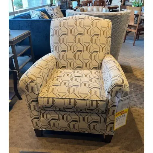 The 933 Chair by Smith Brothers is American made in Berne IN and comes with the manufacturers lifetime warranty on the springs, frame and seat cushion. The chair is done in a taupe and cream printed fabric and is 35 x 36 x 39H. It is regularly $1179 but on clearance for $999. Floor model only. Available for immediate pick up or delivery.
