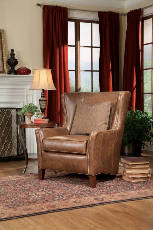 The 825 chair is all American made by Smith Brothers. It’s a transitional straight leg and arm chair with a curved back. Available with or without nail heads.