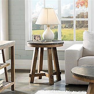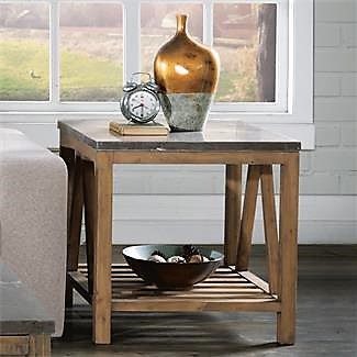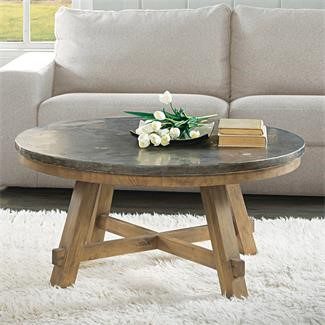 The Weatherford collection are bluestone tables by Riverside. They come with a rustic pine wood base and a bluestone top. The bluestone top gives it a modern industrial element. Available as round or square coffee table.