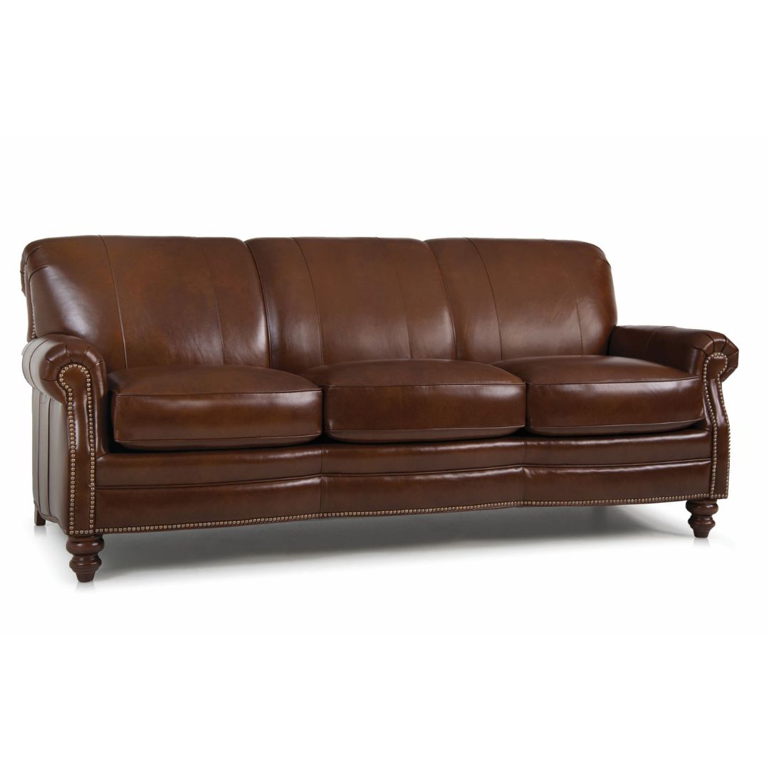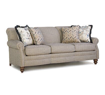 The 383 sofa is all American made by Smith Brothers. It’s a scallop front sofa with tight back and traditional styling with rolled arm. Available with or without nail heads.